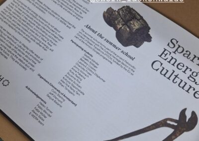 Die Antworten und Gedanken wurden in der Ausstellung „Energie Kultur Erzeugen“/“Sparking Energy Cultures“ anlässlich des Sommerfestes des E-Werks am 12. Juli 2025 präsentiert. Es wurden Objekte, Audio- und Filminstallationen sowie eine interaktive Karte ausgestellt, um die kulturellen und sozialen Verbindungen von Materialien, Infrastruktur und Arbeit zu verdeutlichen. Die Braunkohle wurde von Holzschnitzeln, ein Abfallprodukt der lokalen Holzwirtschaft, abgelöst. Damit sollen das Stadtbad und andere Nachbarn zukünftig mit Strom versorgt werden. Dafür sind nicht nur materielle Infrastrukturen notwendig, sondern auch kulturelle, die einen Energiecampus gestalten/aufbauen, der die Gemeinschaft in den Mittelpunkt stellt.