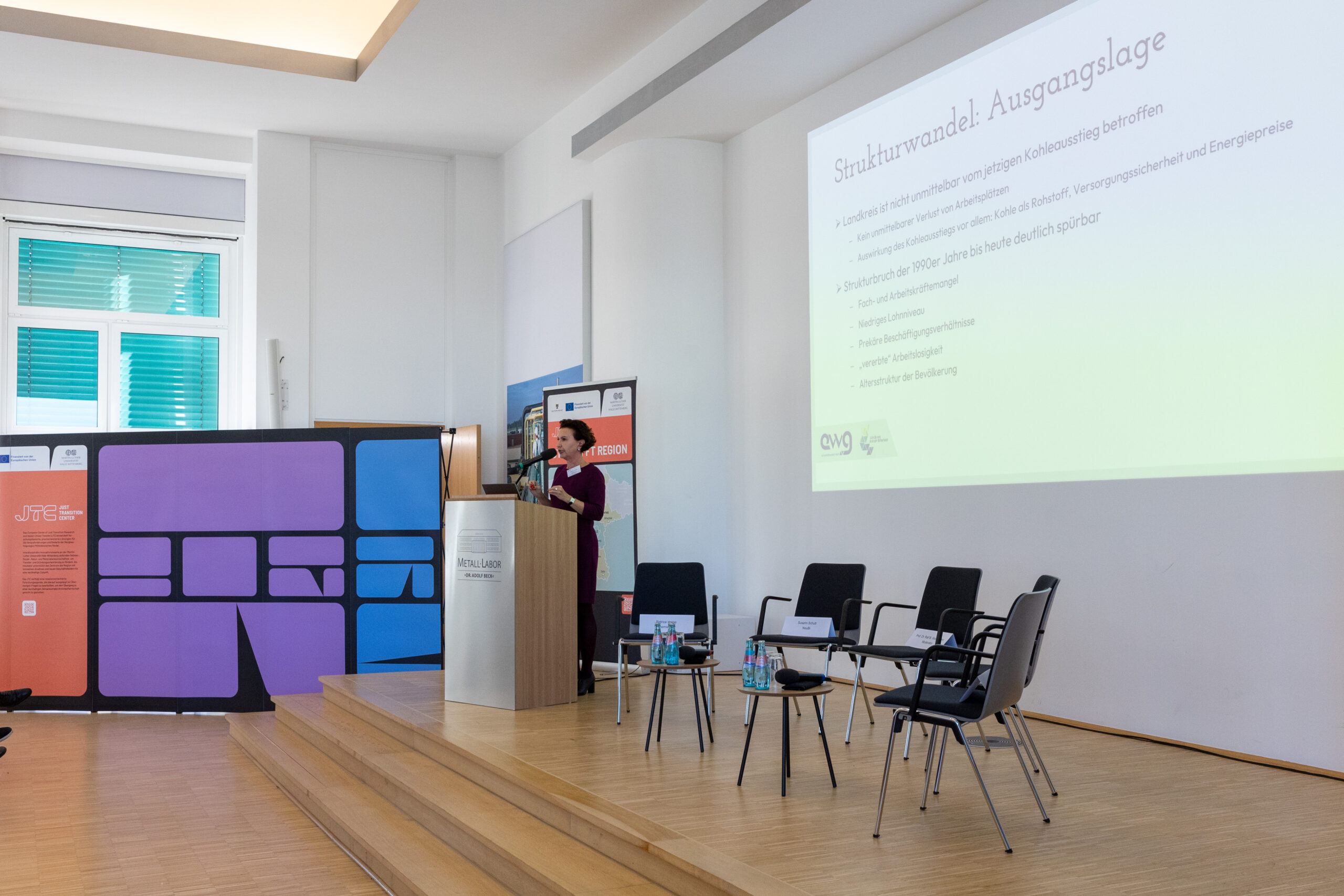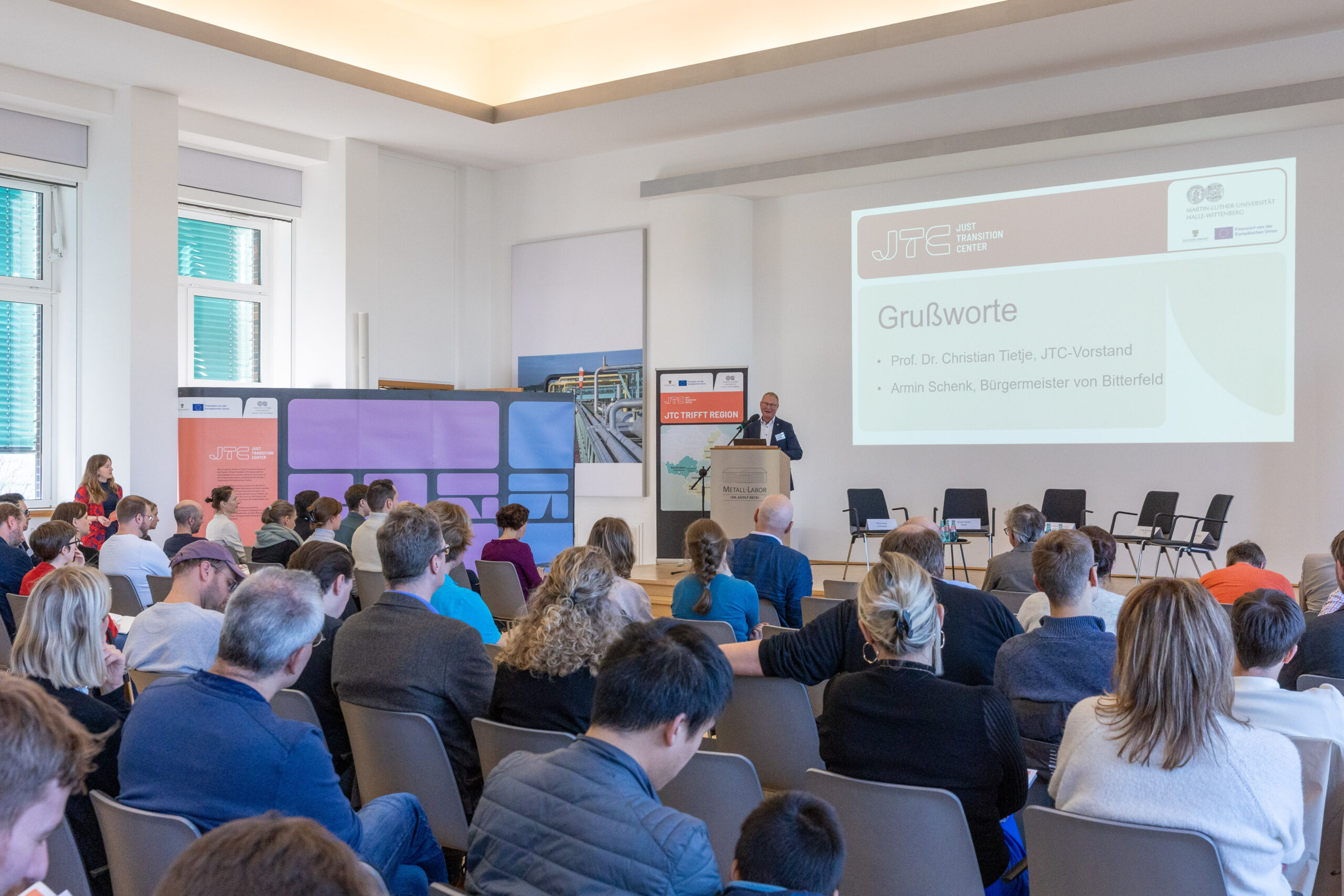Eröffnet wurde die Veranstaltung von Armin Schenk, Oberbürgermeister der Stadt Bitterfeld-Wolfen, und Prof. Dr. Christian Tietje, Vorstand des JTC. Einen zentralen Impuls setzte Elena Herzel von der Entwicklungsgesellschaft Bitterfeld-Wolfen mbH mit ihrem Keynote-Vortrag zu aktuellen Chancen und Herausforderungen der regionalen Transformation in Anhalt-Bitterfeld und darüber hinaus.