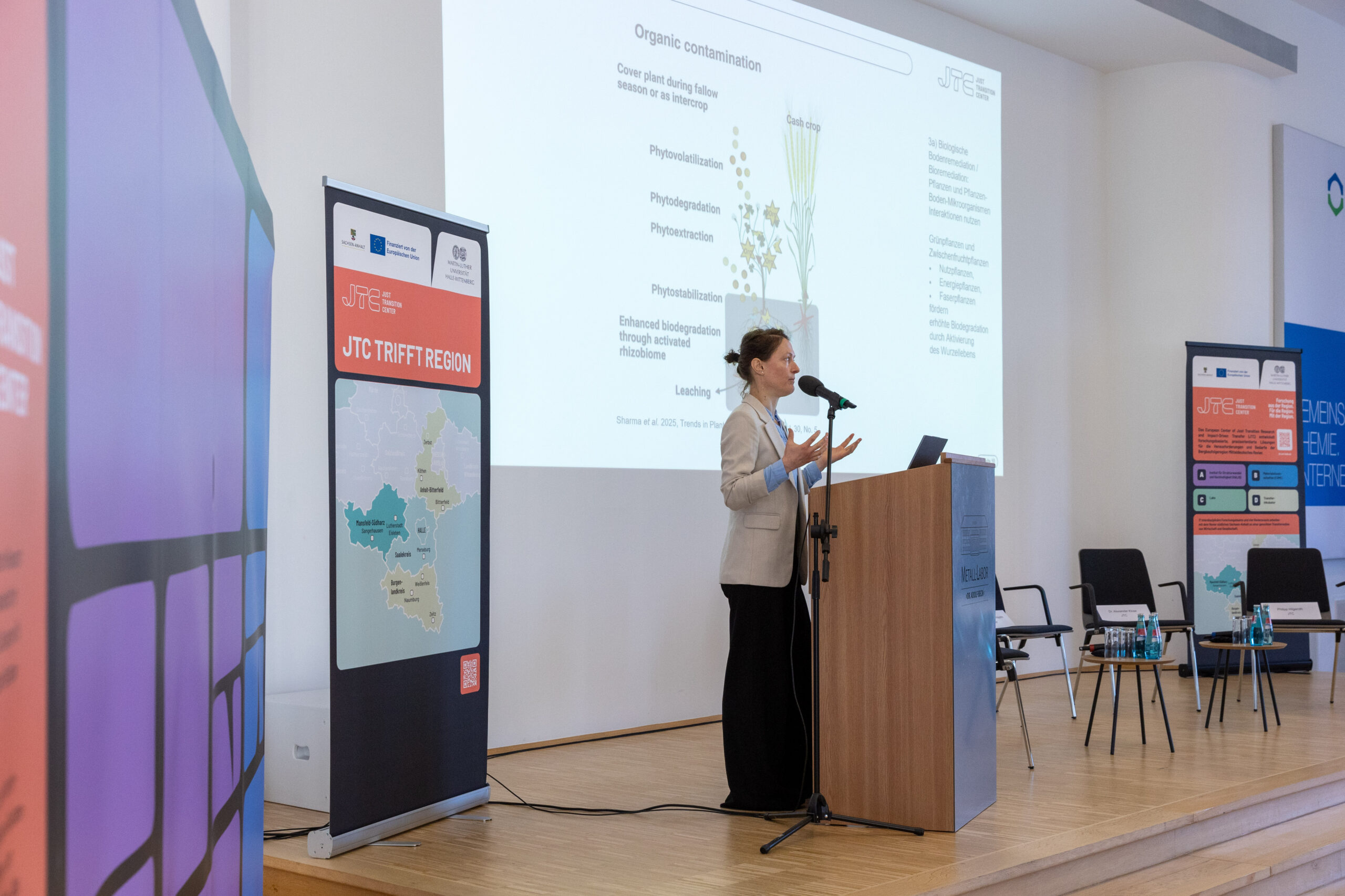 Im Anschluss stellten Forschende des JTC ihre Projekte vor. Dr. Steffi Formann (Team A3, Vernetzung von Strukturwandelregionen) rückte das Projekt zur Bodenremediation „Jetzt Lebensqualität in Bitterfeld neu gestalten“ in den Fokus. Jenny Steinhorst (Team C3, Transformative Bildung) und Hermine Bähr (Team A1, Strukturwandel & Partizipation) gaben Einblicke in die Evaluation des Förderprogramms „Revierpionier“.