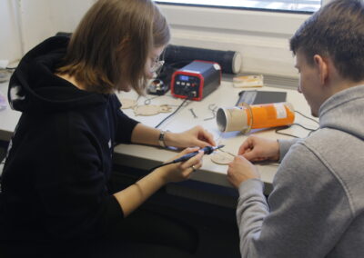 Bereits am Vormittag fanden im ABI LAB des Forum Rathenau e.V., einer lokalen Plattform für Wissenschaft und Bildung, vier Workshops statt, in denen JTC-Teams Einblicke in ihre interdisziplinäre Forschung gaben. Team B5 begeisterte Auszubildende mit einer praxisnahen Demonstration zur Solarenergie, bei der ein von den Teilnehmenden selbst gebauter Bluetooth-Lautsprecher durch ein Solarpanel zum Leben erweckt wurde. Team B2 führte in die spannende Welt der Geologie ein, während Team B1 sich der Bodenforschung widmete – der Schicht über den Gesteinen. Die Teams A4 und C3 nahmen die Teilnehmenden mit auf eine Reise in die Zukunft von Räumen, Erinnerungen und Lebenswelten im Strukturwandel.
