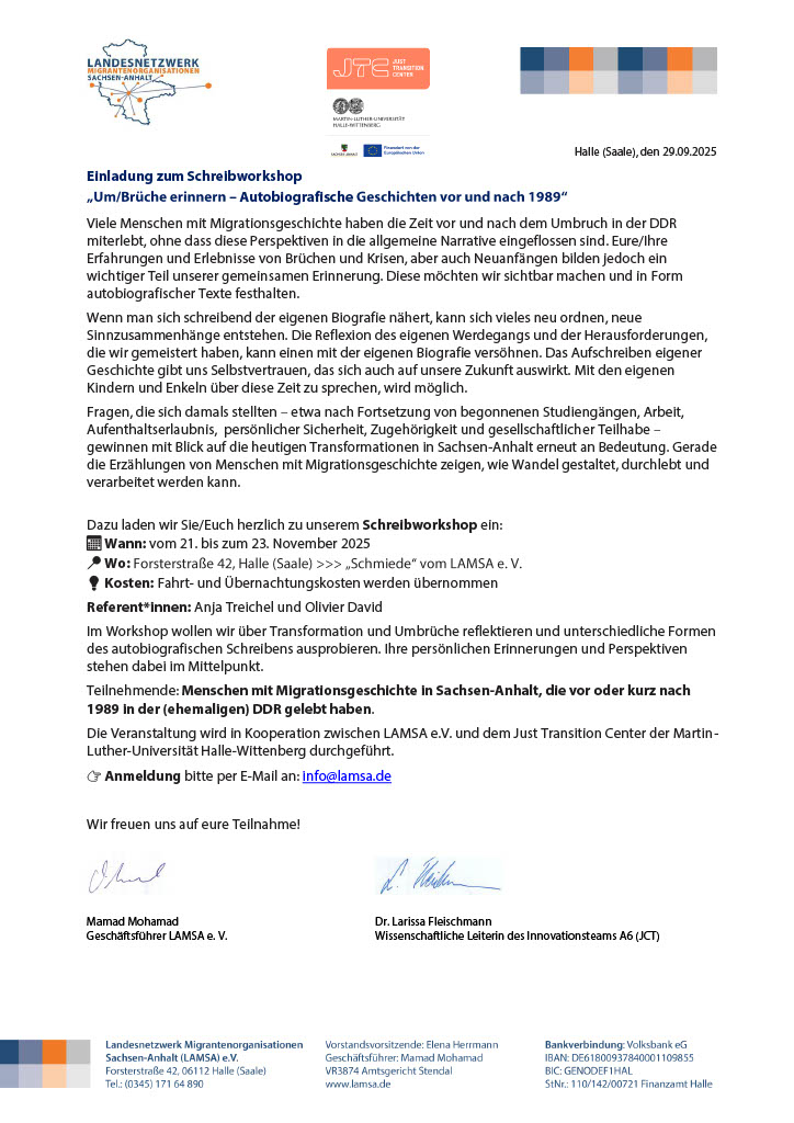 Einladung zum Schreibworkshop „Um/brüche erinnern – Autobiographische Geschichten vor und nach 1989“
